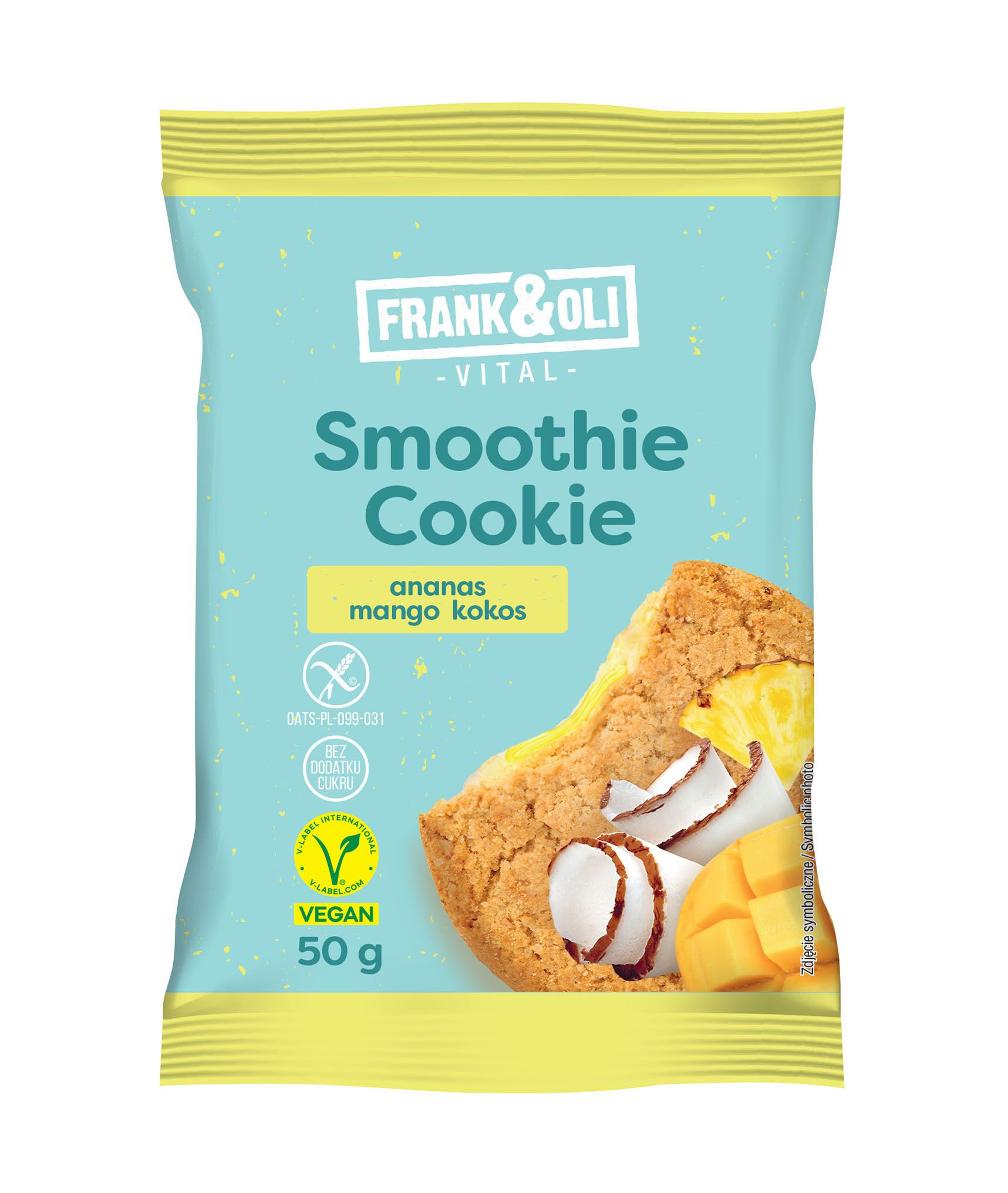 Συστατικά : Νιφάδες βρώμης χωρίς γλουτένη 40 %, ίνες ρίζας κιχωρίου, γέμιση 25 % (πολτός καρύδας 36 %, ίνες ρίζας κιχωρίου, συμπυκνωμένος χυμός ανανά σε αποξηραμένη μορφή 5 %, συμπυκνωμένος χυμός μάνγκο σε αποξηραμένη μορφή 3 %, χυμός λεμονιού, γαλακτωματοποιητής: λεκιθίνη ελαιοκράμβης, φυσικά αρώματα, κουρκουμάς), πολτός καρύδας 14 %, γαλακτωματοποιητής: λεκιθίνη ελαιοκράμβης, αλάτι Ιμαλαΐων.