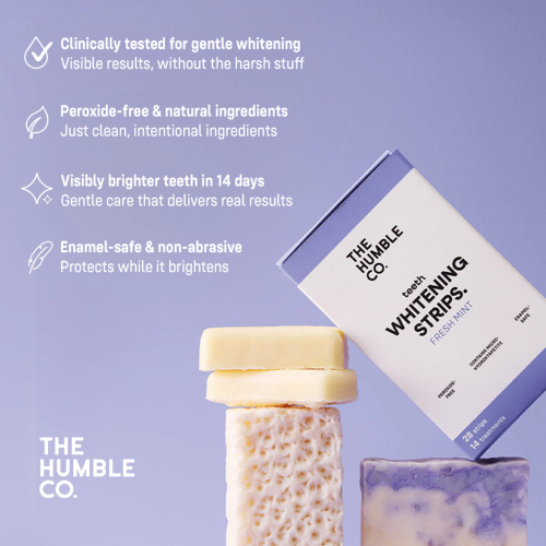 Οι ταινίες λεύκανσης δοντιών The Humble Co. είναι ειδικά σχεδιασμένες για ήπια και αποτελεσματική λεύκανση, χωρίς να βλάπτουν το σμάλτο των δοντιών. Φτιαγμένες με φυσικά συστατικά και χωρίς υπεροξείδιο, είναι κατάλληλες για καθημερινή χρήση.